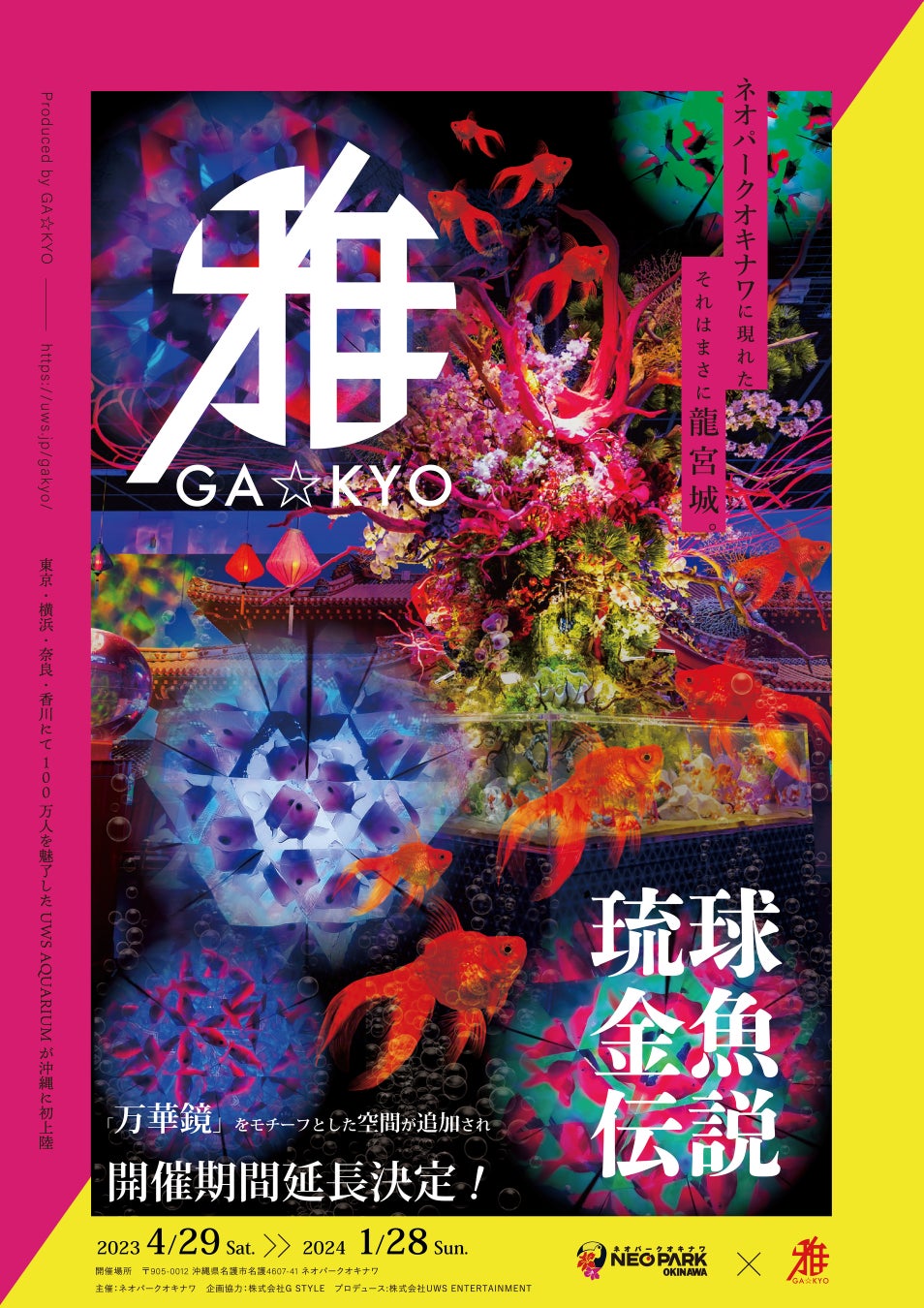 日本の伝統・伝説×アクアリウム のアート施設「UWS AQUARIUM GA☆KYO(お台場)」の龍宮城エリアのコンセプトをベースとし、沖縄の歴史や伝統文化をアクアリウムで表現。中国から琉球(沖縄)を経て薩摩(鹿児島)に持ち込まれ、後に日本全土へ普及していったとされる金魚「琉金」をメインに、30種700匹の金魚を約200坪の空間へ展示しました。