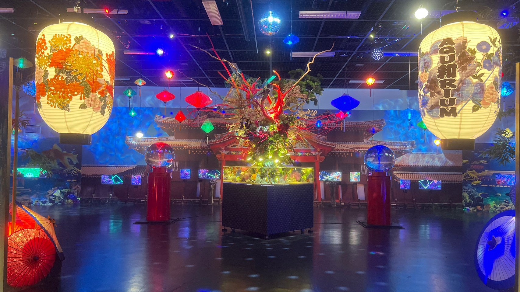 当イベントでは、メイン展示となる「雅 琉球竜宮盆栽」の上部にミラーボールを配置し、各球体水槽の上にはデジタルミラーボールをそれぞれ1個ずつ設置しました。さらに、四季をテーマとした水槽4本には六角形のミラーと、大小異なるクリスタルボールを吊り下げております。また、水槽の前にはオリジナルの万華鏡を新たに設置し、提灯についても、テンポ良くランダムに光るパターンに変更しました。会場の雰囲気を高めるためのBGMも新たにセレクトし、全体の雰囲気を一新しております。新しい装飾と音楽で、皆様に更なる感動をお届けすることをお約束します。