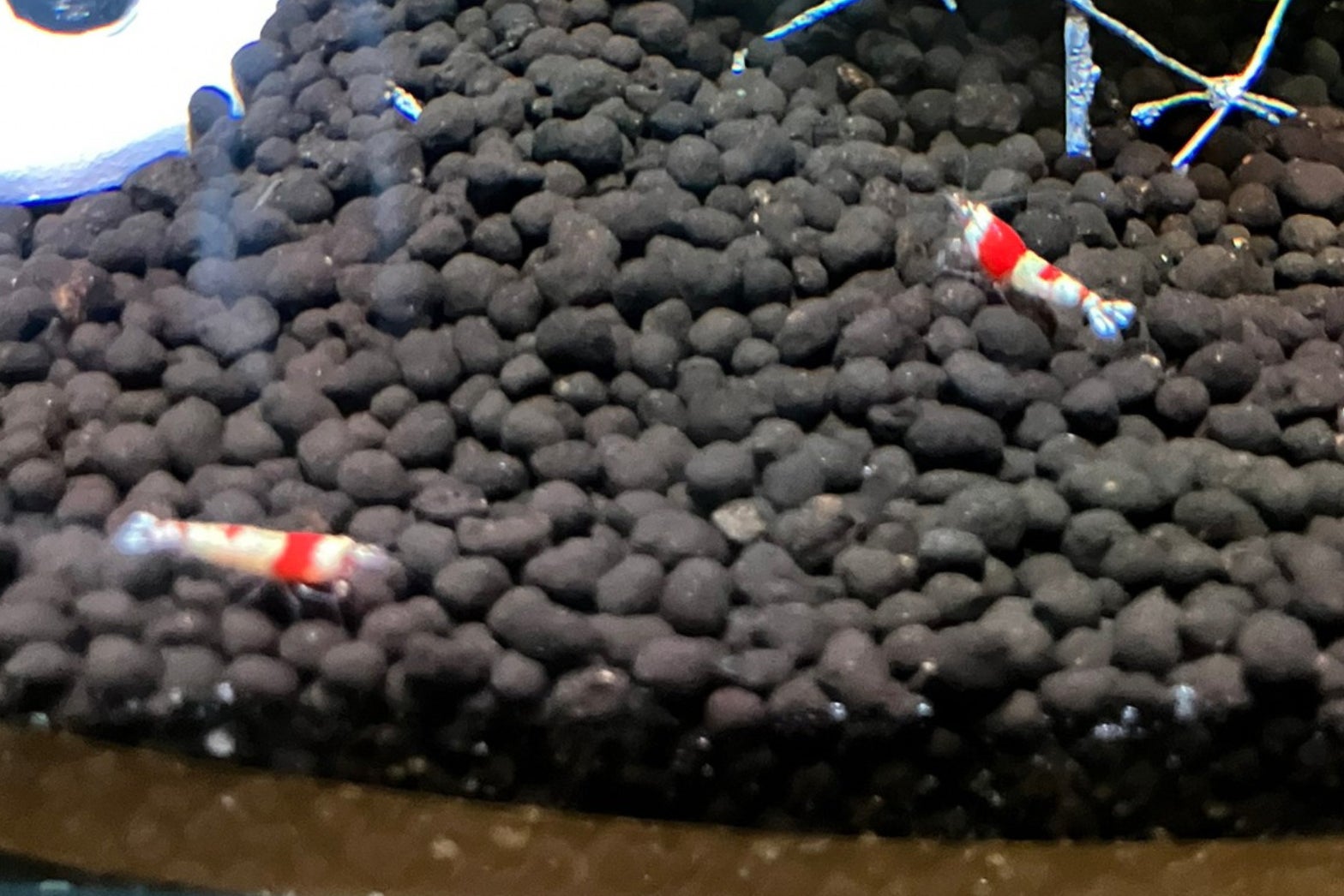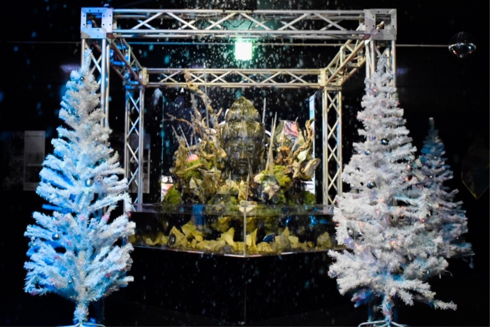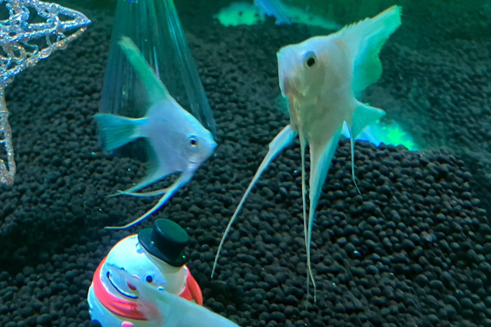 クリスマスを連想させる紅白のツリーと魚の展示に加え、雪降る仕掛けも登場!