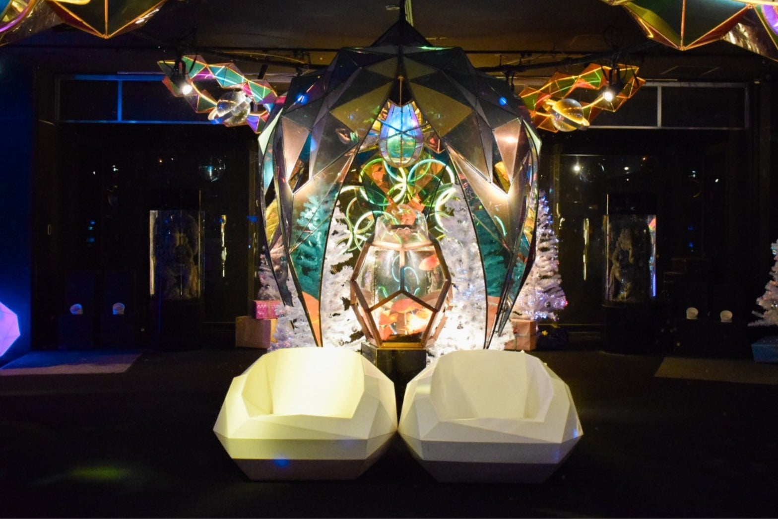 音楽用語で交響曲を意味する「シンフォニー」。一般的には複数の楽器が調和して演奏される、複雑で豊かな音楽作品を指します。より広い意味では、異なる要素が調和して一つの大きな作品や効果を生み出すことを表すのにも使われます。今回の展示では、「宇宙×アクアリウム」の空間をクリスマスイルミネーションのフィルターに通すことで、視覚的なハーモニーを創り出す様をイメージし、宇宙の広がりと水の静けさを背景に、訪れる人々に特別な体験を提供します。
