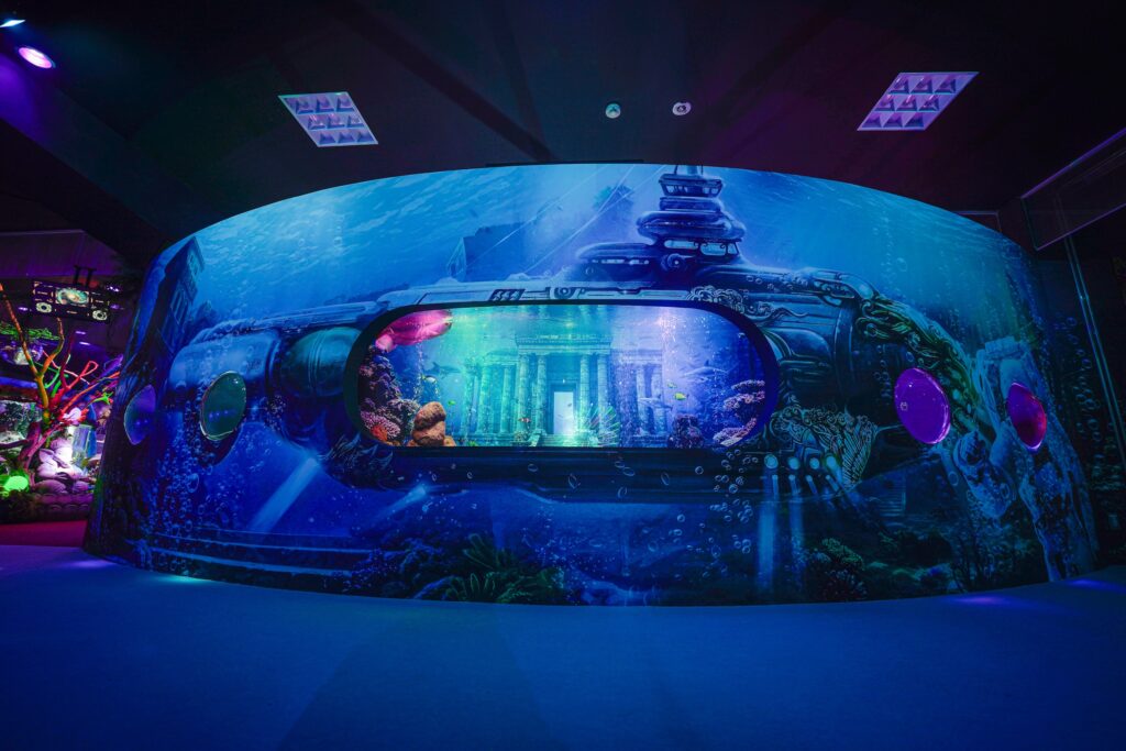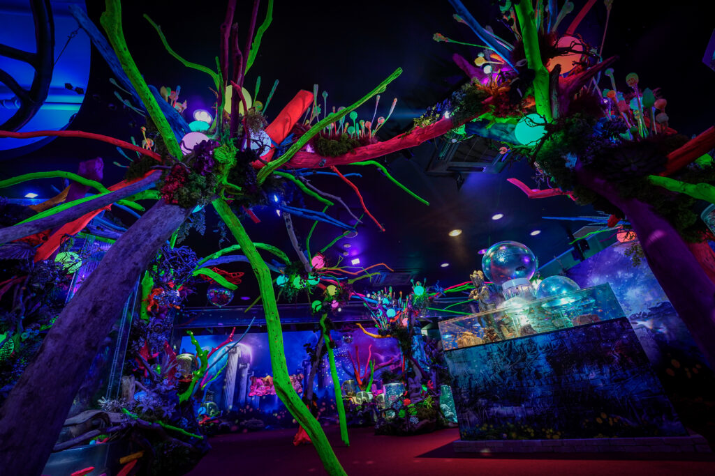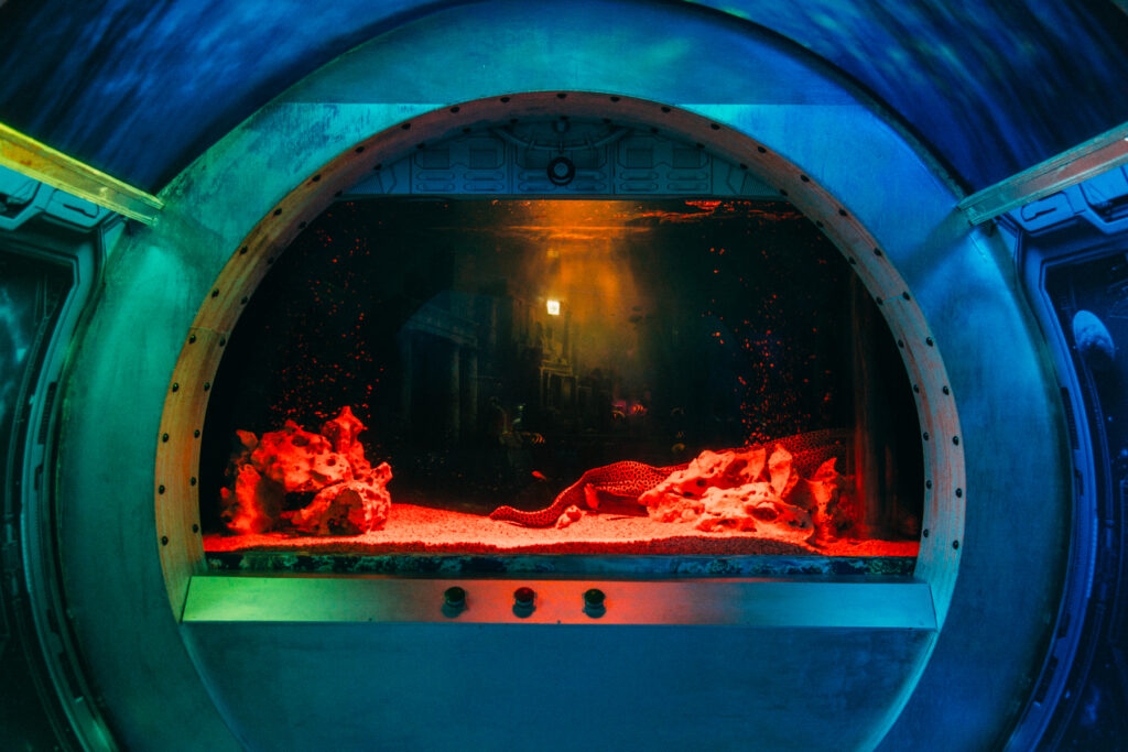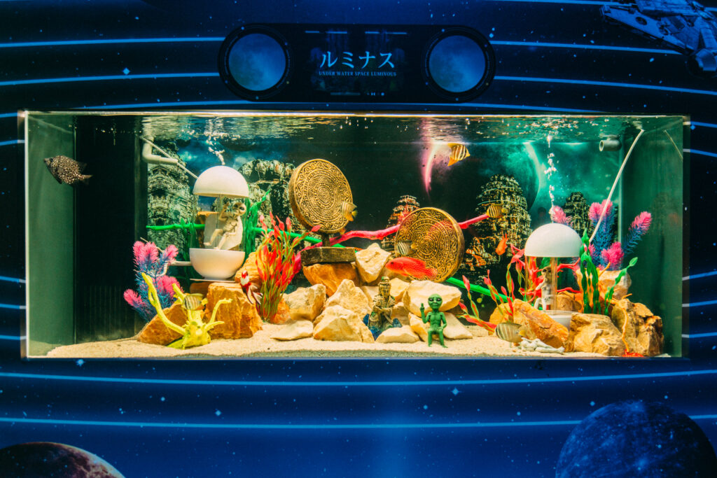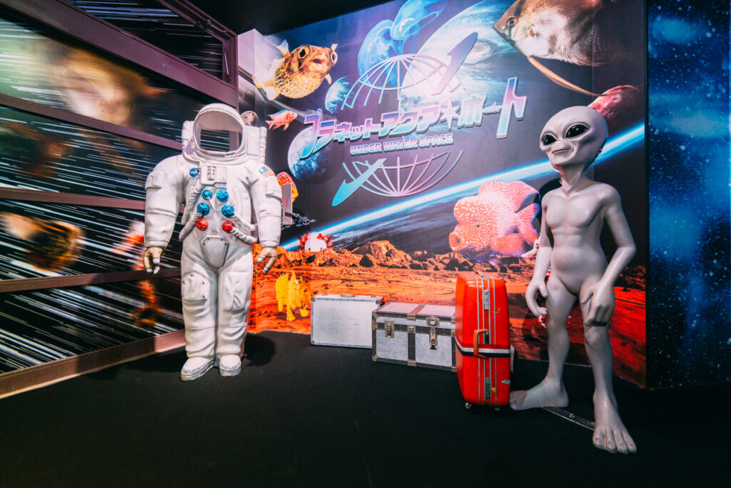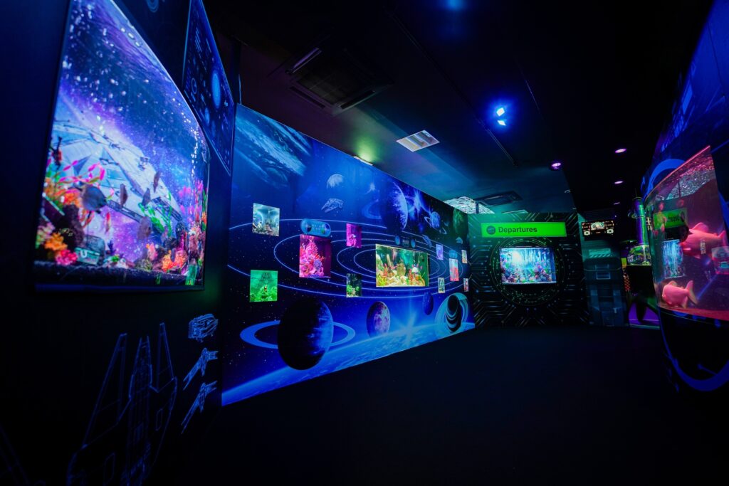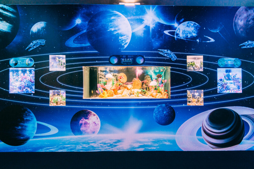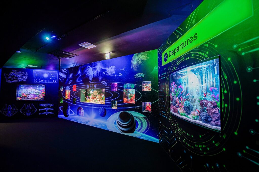 - 本施設は、“宇宙を旅するアクアリウム”をテーマにした没入型の展示で、来場者は“宇宙船の乗客”とねって全10エリアを巡り、、出発から帰還までのプロセスを体験します。光・音・映像・香りと、生きた水生生物を組み合わせることで、フィクションと現実が重なる独特の臨場感を生み出します。