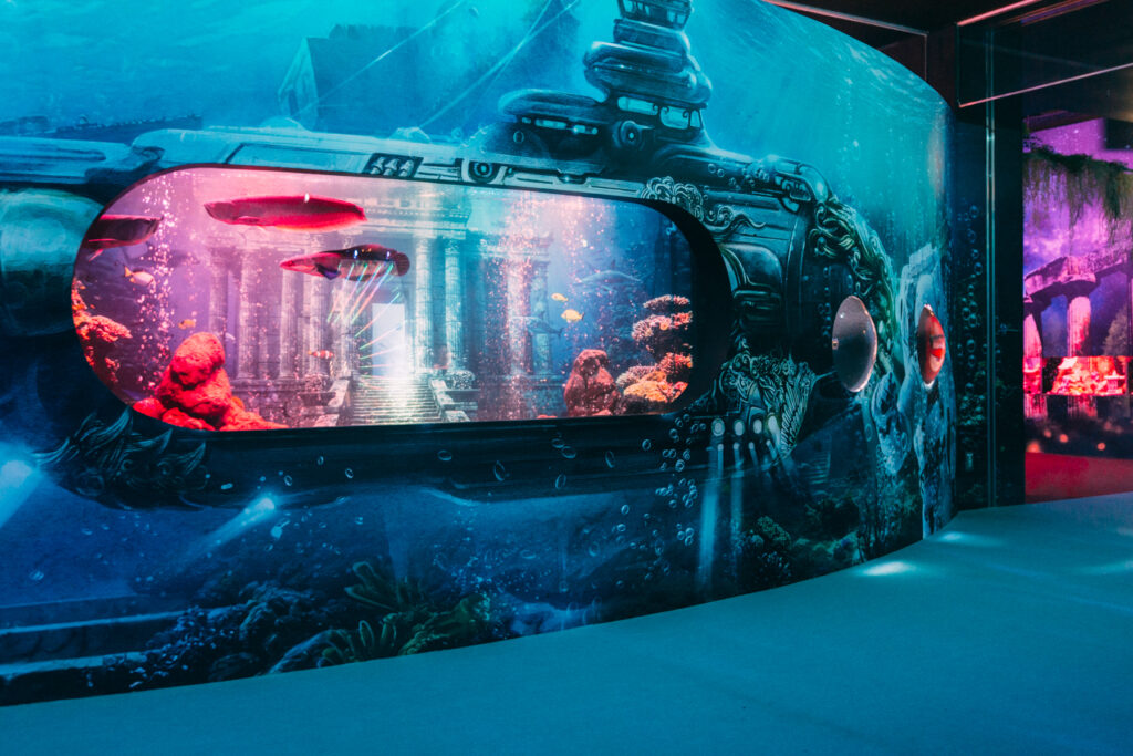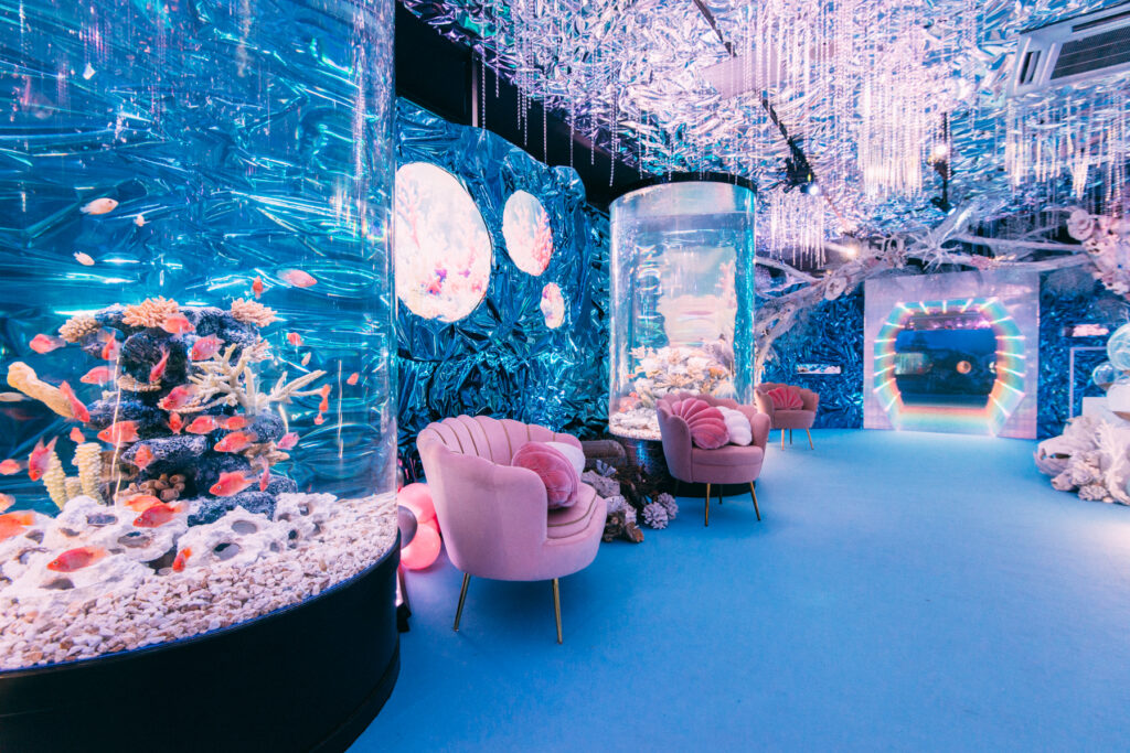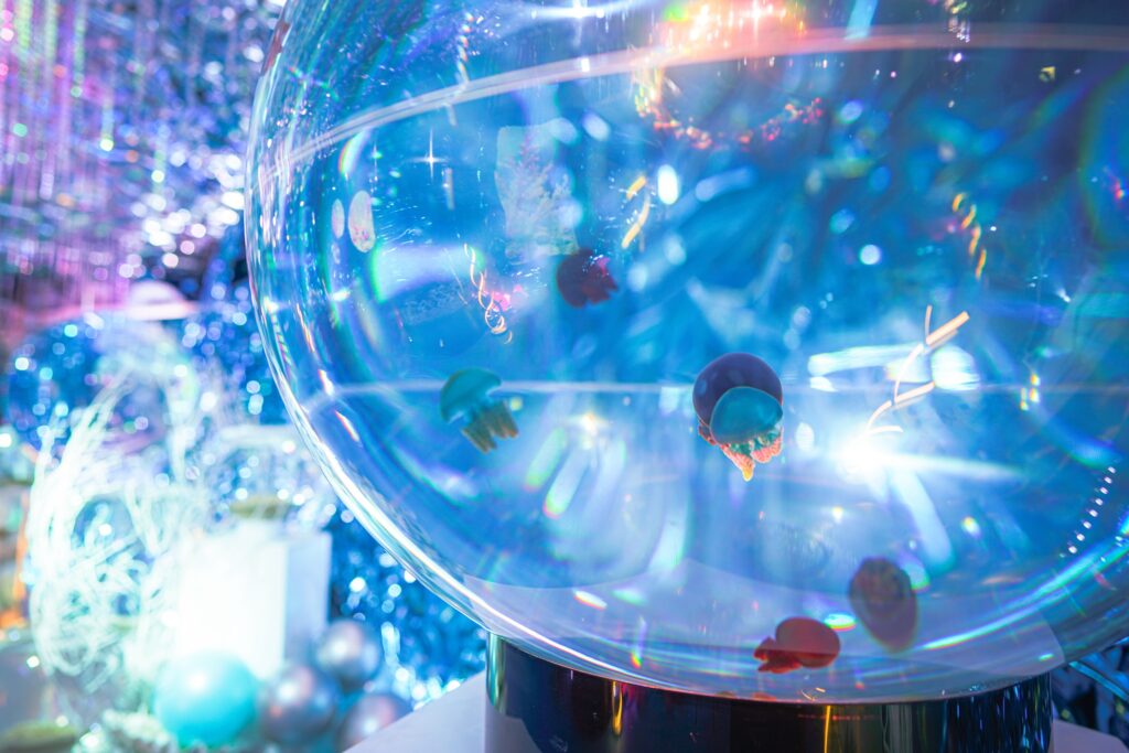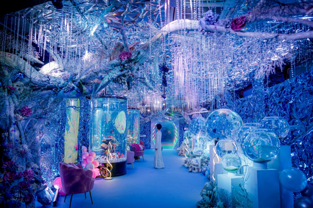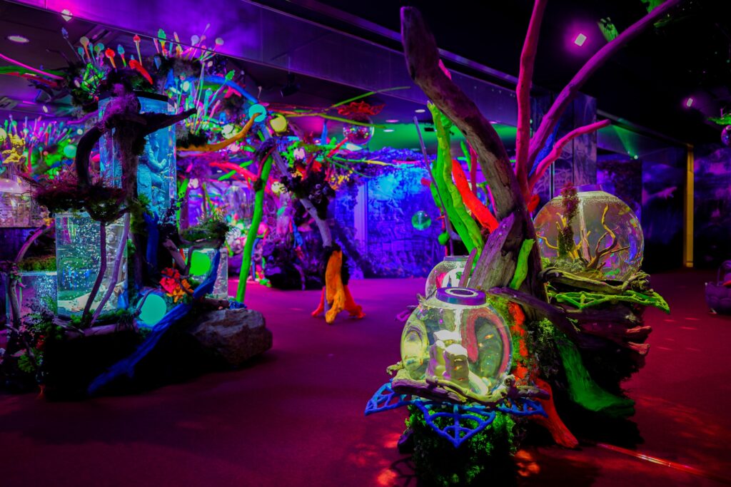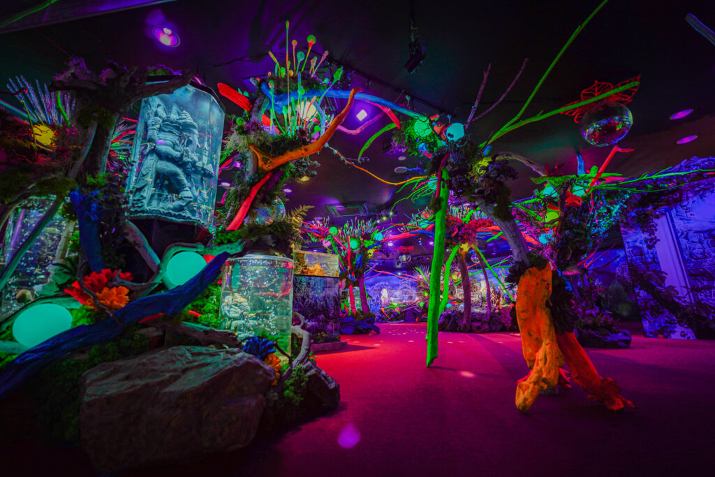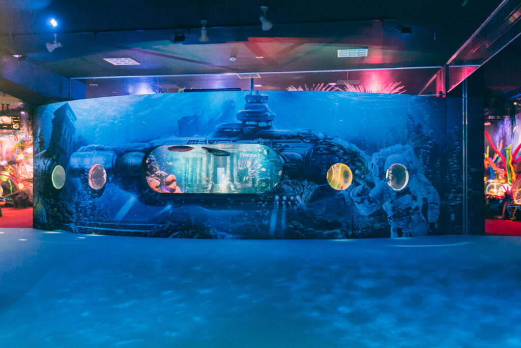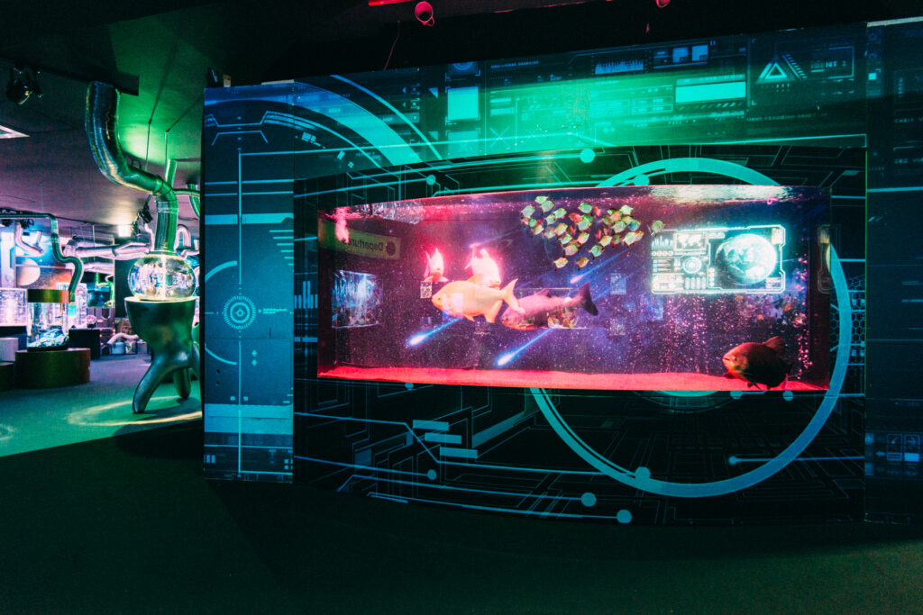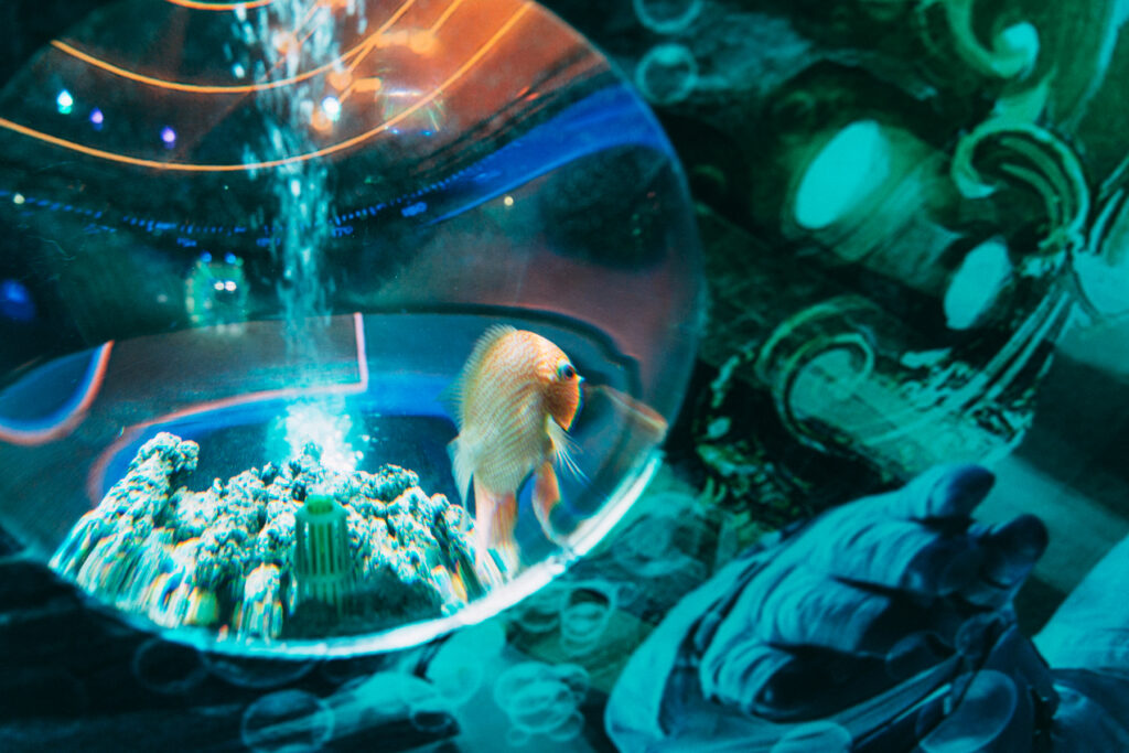 - 本施設は、“宇宙を旅するアクアリウム”をテーマにした没入型の展示で、来場者は“宇宙船の乗客”とねって全10エリアを巡り、、出発から帰還までのプロセスを体験します。光・音・映像・香りと、生きた水生生物を組み合わせることで、フィクションと現実が重なる独特の臨場感を生み出します。