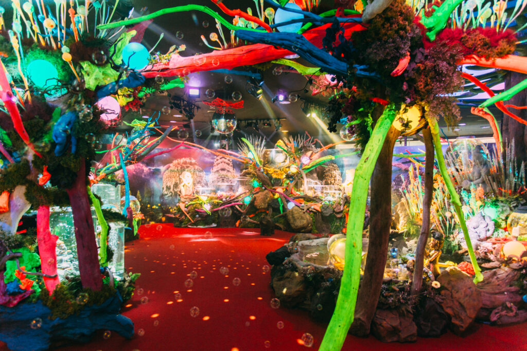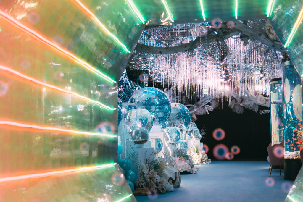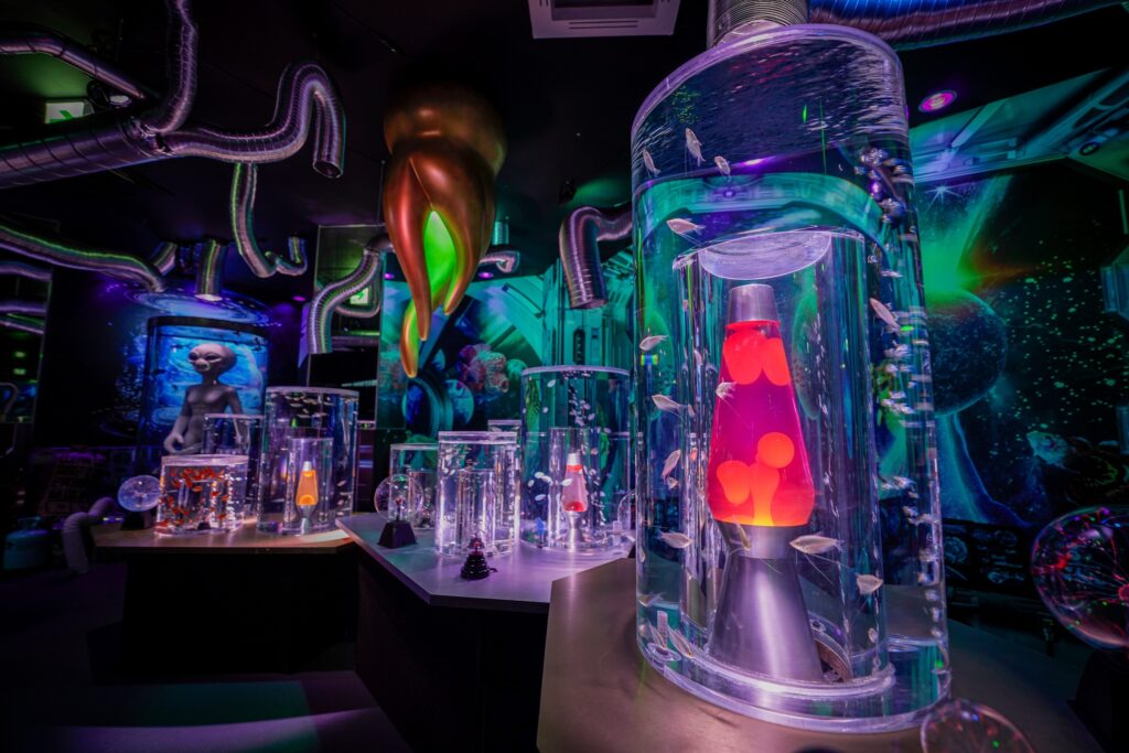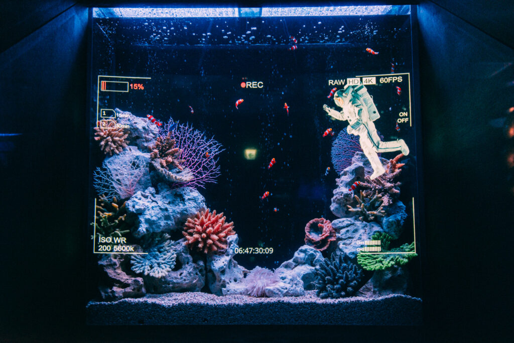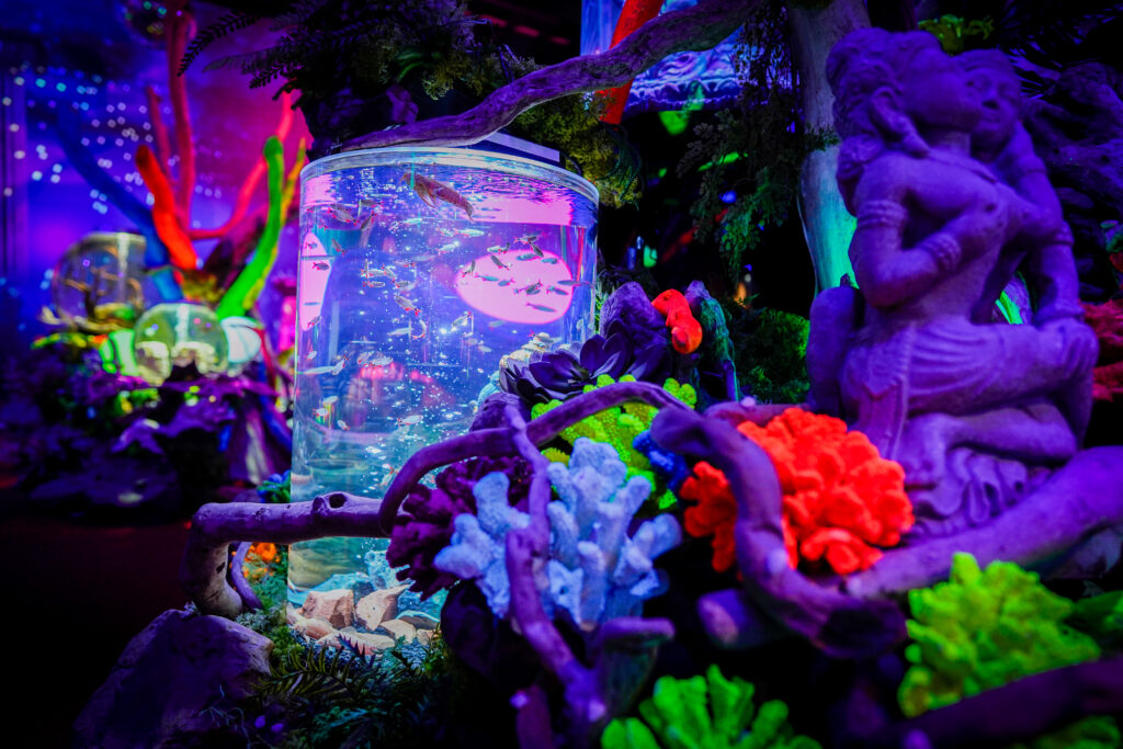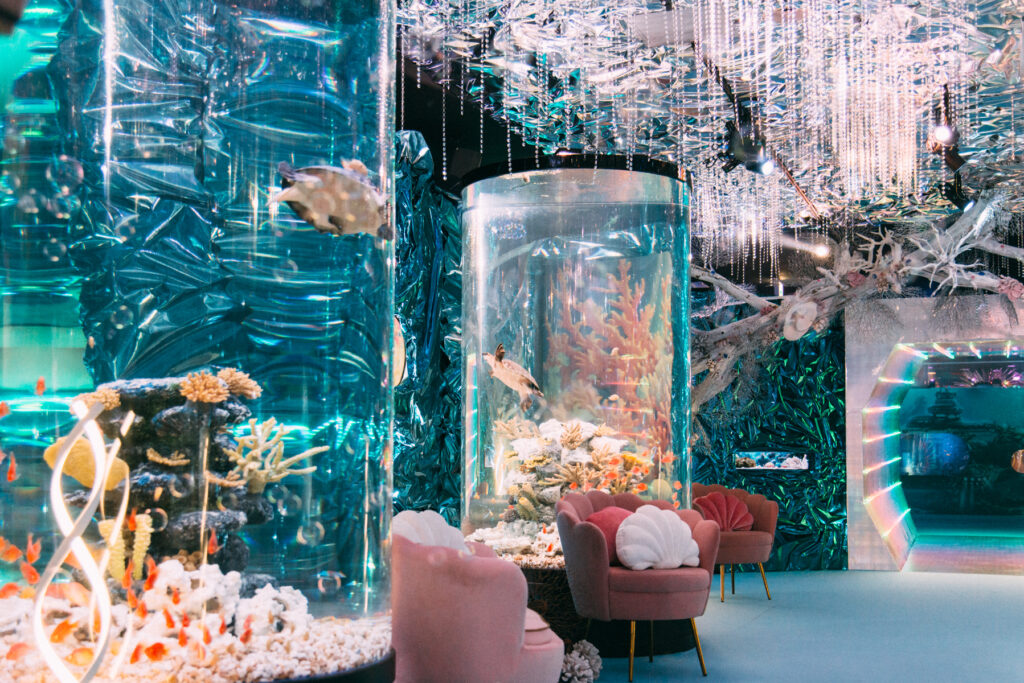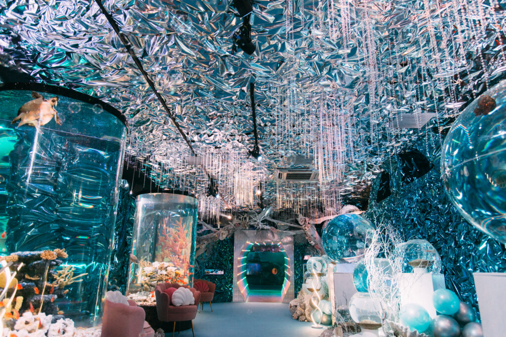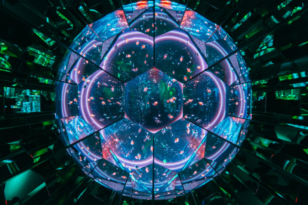 - 本施設は、“宇宙を旅するアクアリウム”をテーマにした没入型の展示で、来場者は“宇宙船の乗客”とねって全10エリアを巡り、、出発から帰還までのプロセスを体験します。光・音・映像・香りと、生きた水生生物を組み合わせることで、フィクションと現実が重なる独特の臨場感を生み出します。